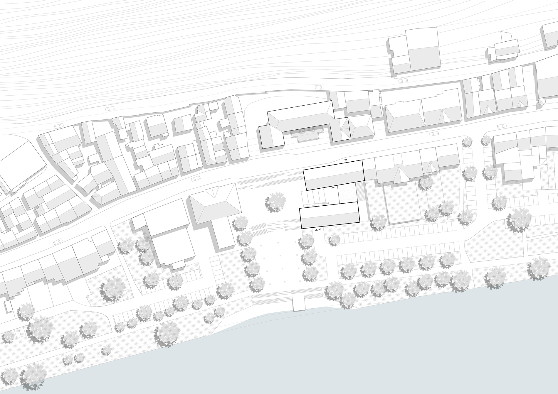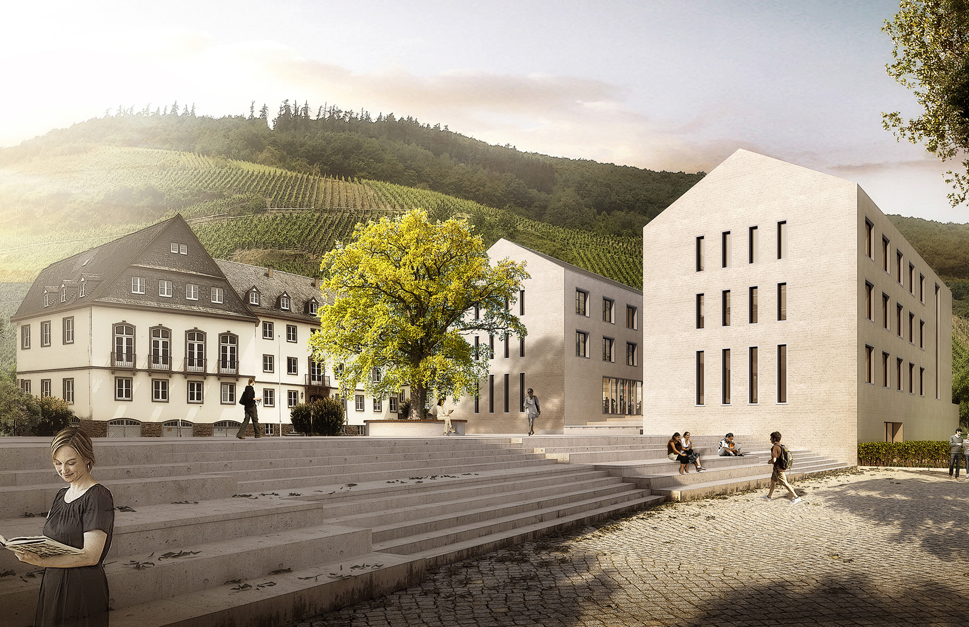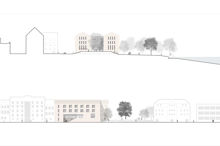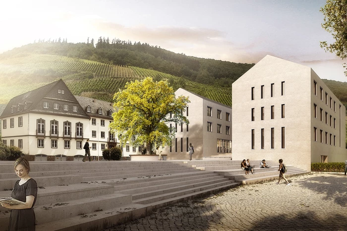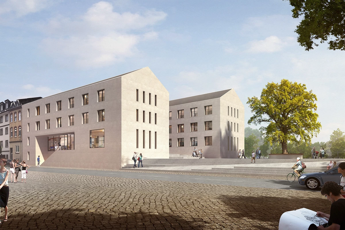 Von der Schlossstraße und der Parkgarage aus stellt ein gemeinsamer Aufzug den barrierefreien Zugang des Neubaus sicher. Alternativ ist die Erschließung mittels Rampen über den Rathausplatz möglich. Beide Zugänge erschließen das zentrale Foyer. Sowohl das Gebäude als auch der Platz erfahren durch die alternativen Zugangsmöglichkeiten eine Aufwertung. Die Fassaden reagieren auf die jeweiligen stadträumlichen Gegebenheiten: traufständige Ausrichtung zur Schlossstraße und zum Moselufer, giebelständige zum Rathausplatz. Fassaden und Dacheindeckungen werden mit regionalen Materialien gestaltet.