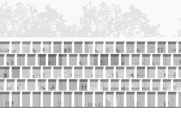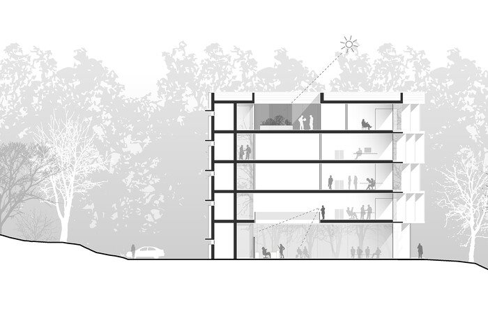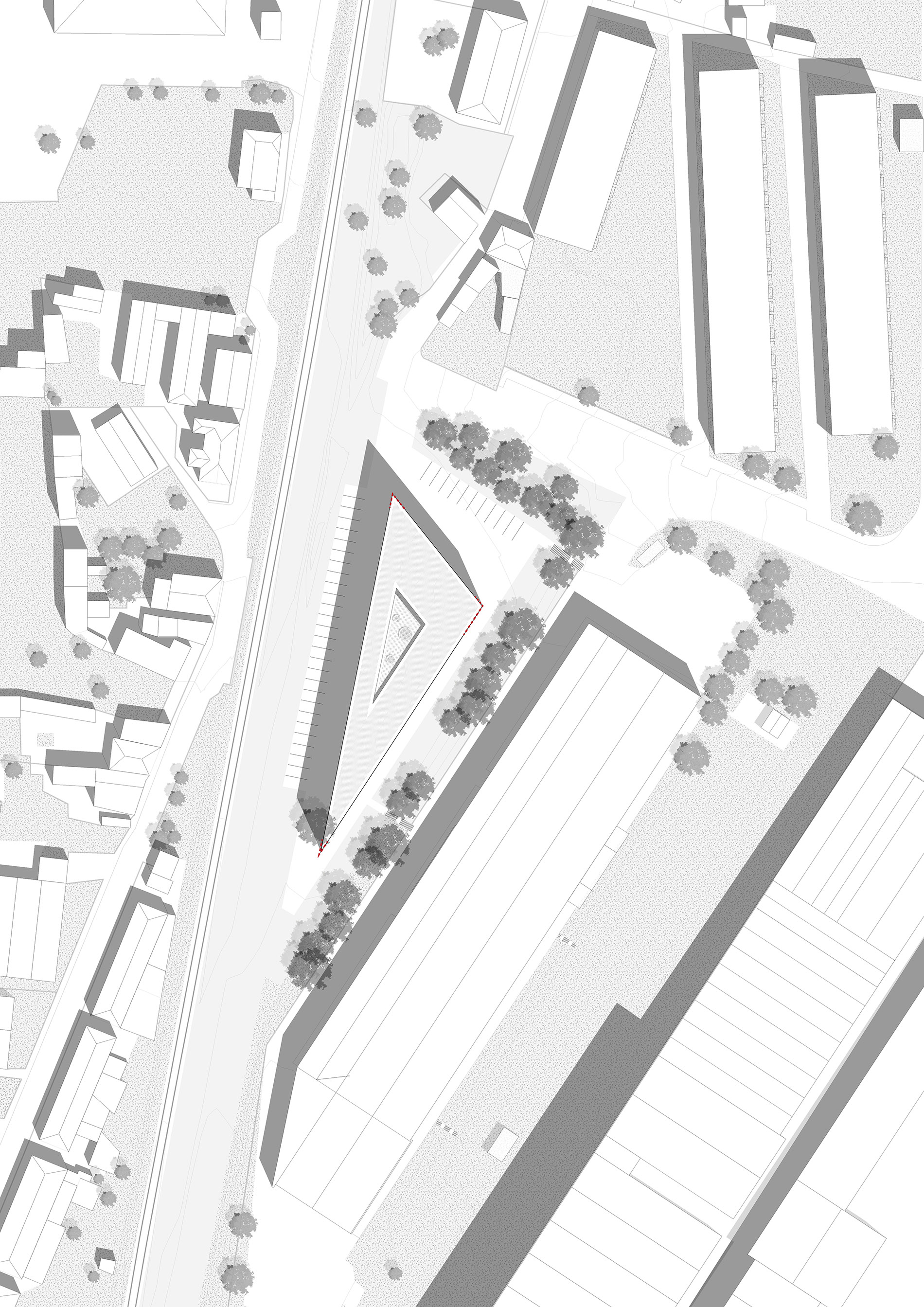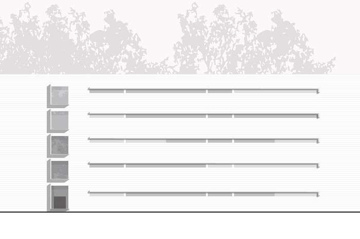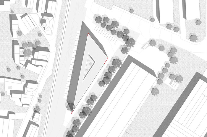 Die Gebäudevolumetrie in Dreiecksform entspricht den Grundstücksgrenzen. Zur Bahnlinie wurde aus Schall- und Sichtschutzgründen eine Wandscheibe mit minimalen Öffnungen geplant, an die alle Servicefunktionen angegliedert sind. Die restlichen Fassaden öffnen sich großzügig zum Außenraum und variieren das Thema der Brise Soleil entsprechend den verschiedenen Himmelsrichtungen.