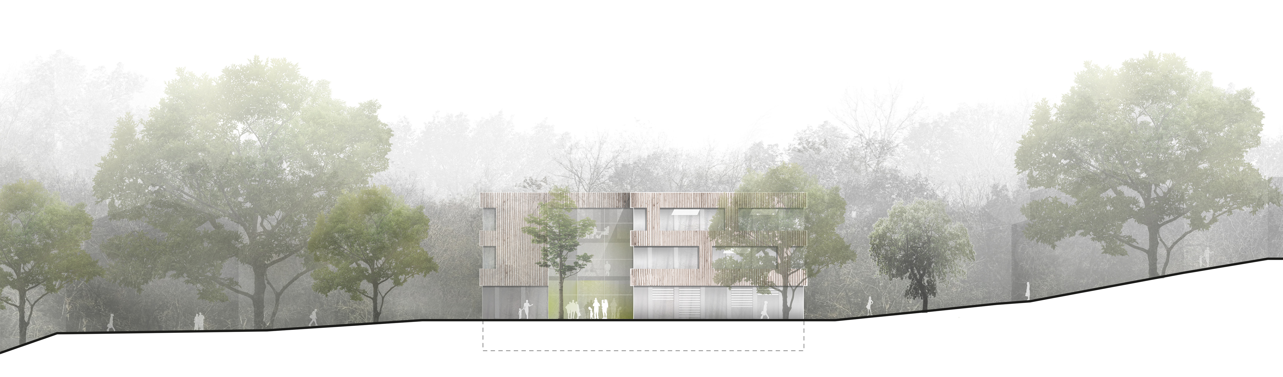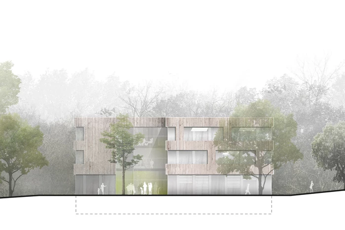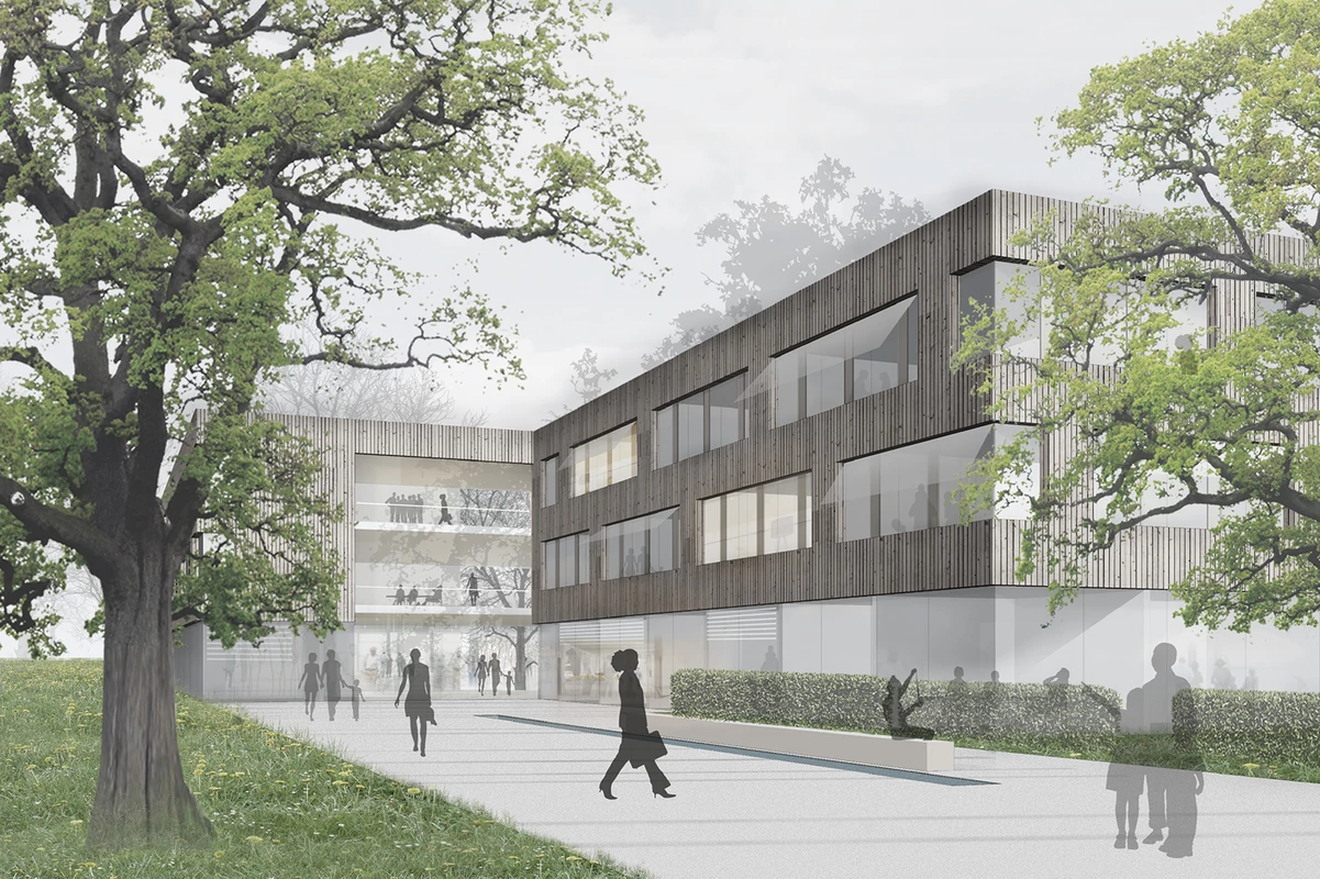 Gebäudeform und Situierung des ersten und zweiten Bauabschnittes sind so gewählt, dass sowohl mit als auch ohne Erweiterung ein stimmiges Erscheinungsbild generiert wird.