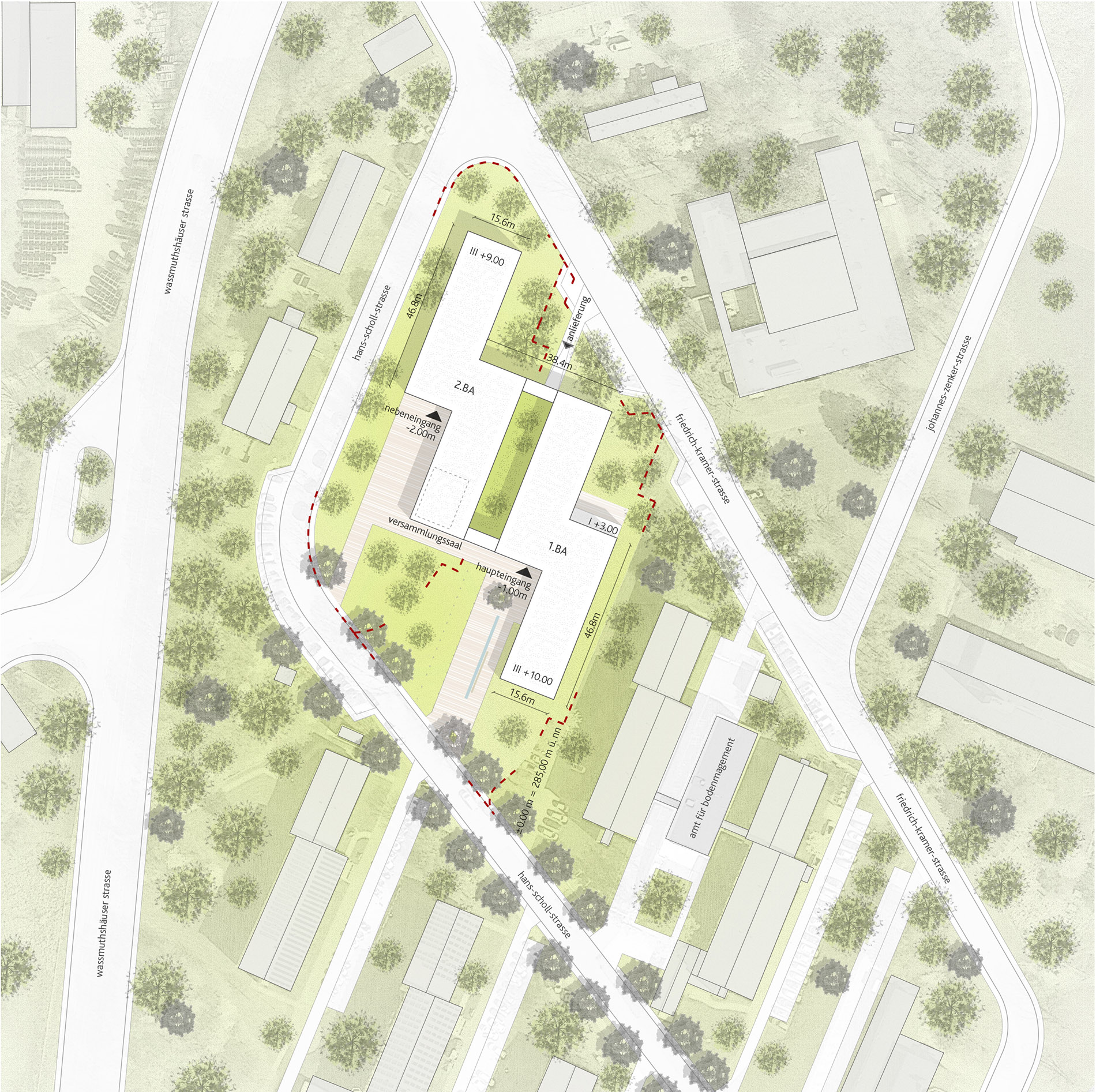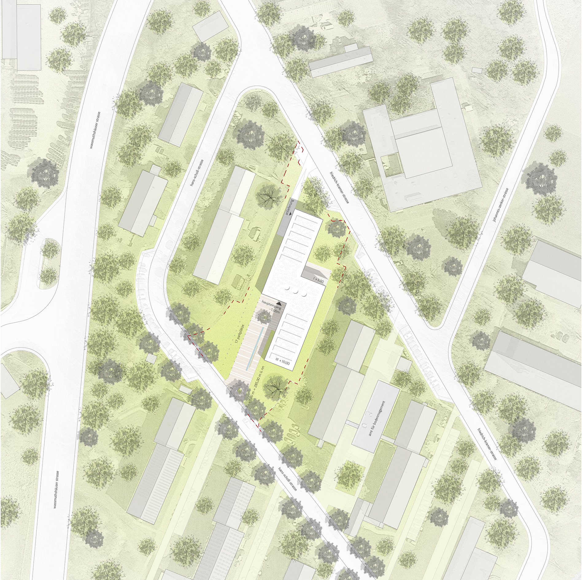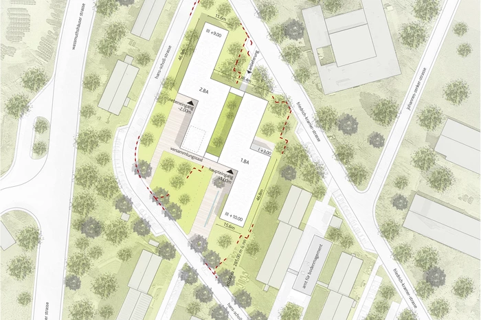 Die für das Areal charakteristische städtebauliche Struktur wird aufgegriffen und dient als Grundlage für die Positionierung des Neubaus und die Gliederung der Gebäudevolumetrie. Die Parallelität der längsrechteckigen Bestandsgebäude und die durchgängigen Grünzonen werden fortgeführt, so dass der neue Verwaltungsbau einerseits ein selbstverständlicher Teil der Gesamtanlage wird. Andererseits hebt er sich durch seine Gebäudeform, seine Materialität und einen großzügig ausformulierten Vorplatz von den umliegenden Gebäuden deutlich ab und markiert innerhalb der regelmäßigen Struktur einen eindeutigen Mittelpunkt.