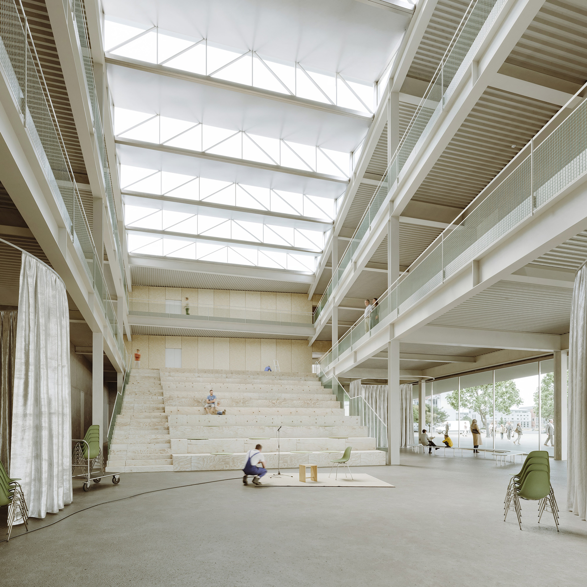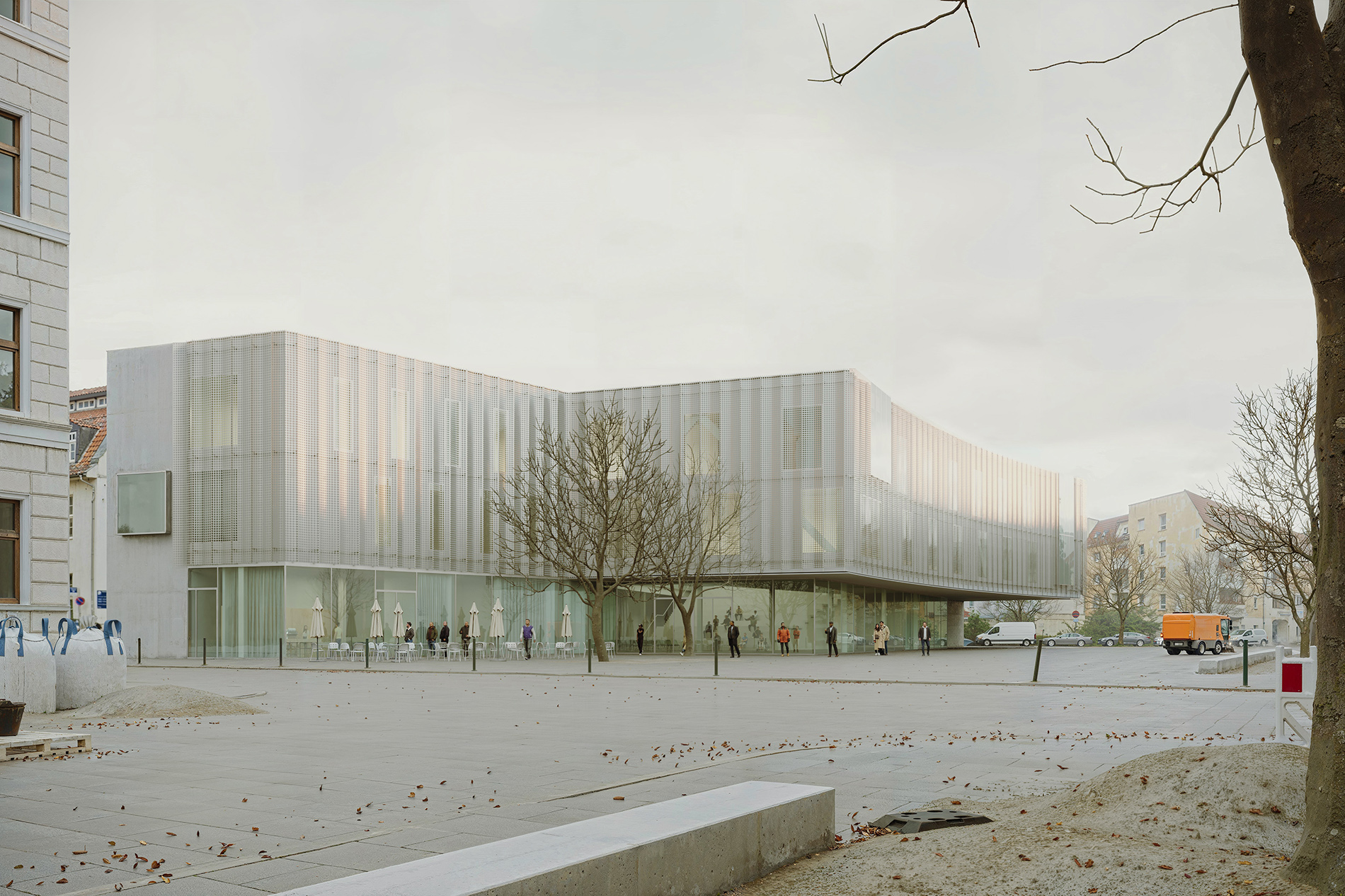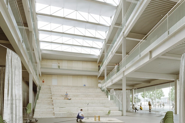 Die Erdgeschosszone zeichnet sich im Bereich Café/Shop/Foyer/Atrium durch eine hohe Transparenz aus, um die Niederschwelligkeit für die Nutzer zu unterstützen. Innen- und Außenraum scheinen nahtlos ineinander überzugehen. Passanten erhalten Einblicke und werden zum Erkunden eingeladen. Um die beiden Obergeschosse legt sich wie ein Vorhang eine perforierte Fassadenhülle aus Metallblechen, die als Schutzschild gegen Sonne, Blendung und Wärmestrahlung dienen. Schemenhaft treten die dahinterliegenden Fensteröffnungen bzw. Wandscheiben in Erscheinung. Es entstehen subtile, wechselnde Lichtverhältnisse, die stets neue Eindrücke und Bilder entstehen lassen. Die Verwendung vorfabrizierter, industrieller Elemente verkürzt die Montagezeit und lässt eine leichte Rückbaubarkeit zu.