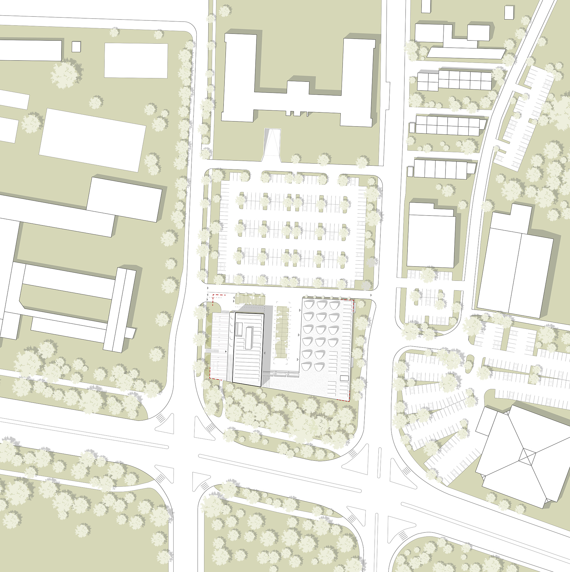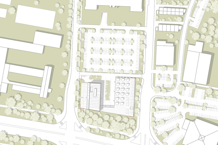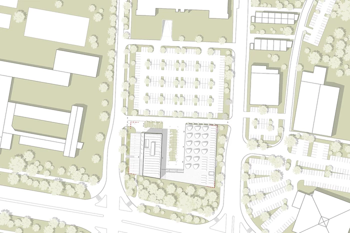 Um eine eindeutige Adressbildung und die Zeichenhaftigkeit des Gebäudes zu unterstützen wird der Verwaltungsteil als Hochpunkt ausgebildet, der trotz des zum Teil sehr hohen Baumbestands des vorgelagerten Biotops von weither sichtbar ist. Nach Norden, von den umliegenden Straßen nicht einsehbar, liegt zwischen dem Verwaltungsgebäude und den Werkstätten der Werkstatthof. Die Dachfläche des Werkstattbereichs, die von den Büroräumen aus sichtbar ist, ist als fünfte Fassade von besonderer Bedeutung und wird mit ihren bepflanzten „Lichtaugen“ und der flächigen Begrünung zu einer im wahrsten Sinne des Wortes „Dachlandschaft“ ausgebildet.