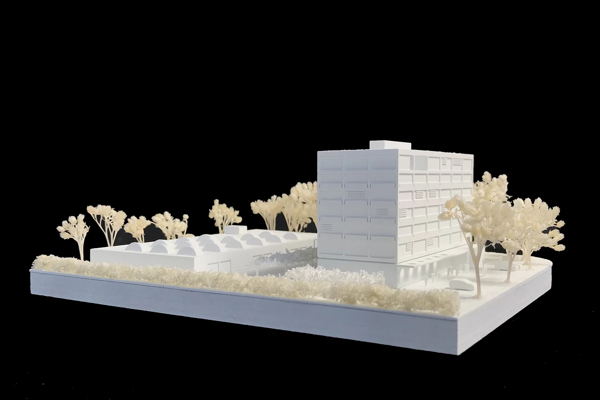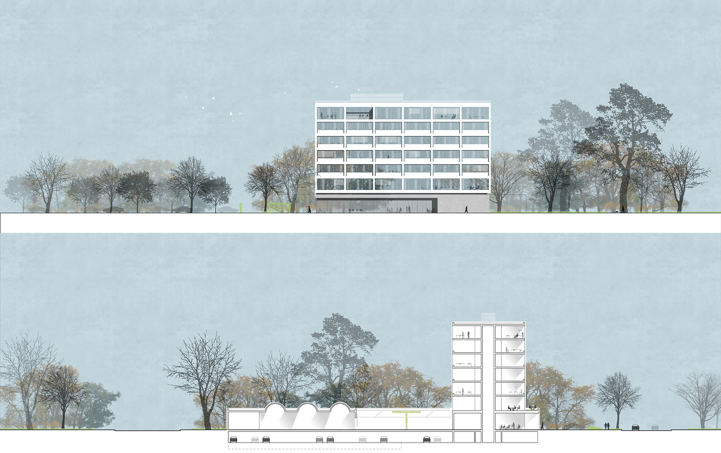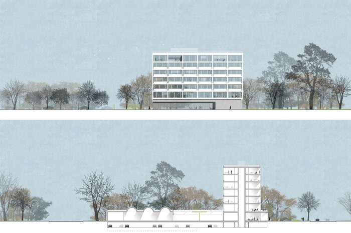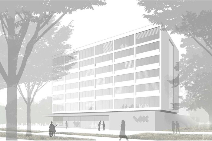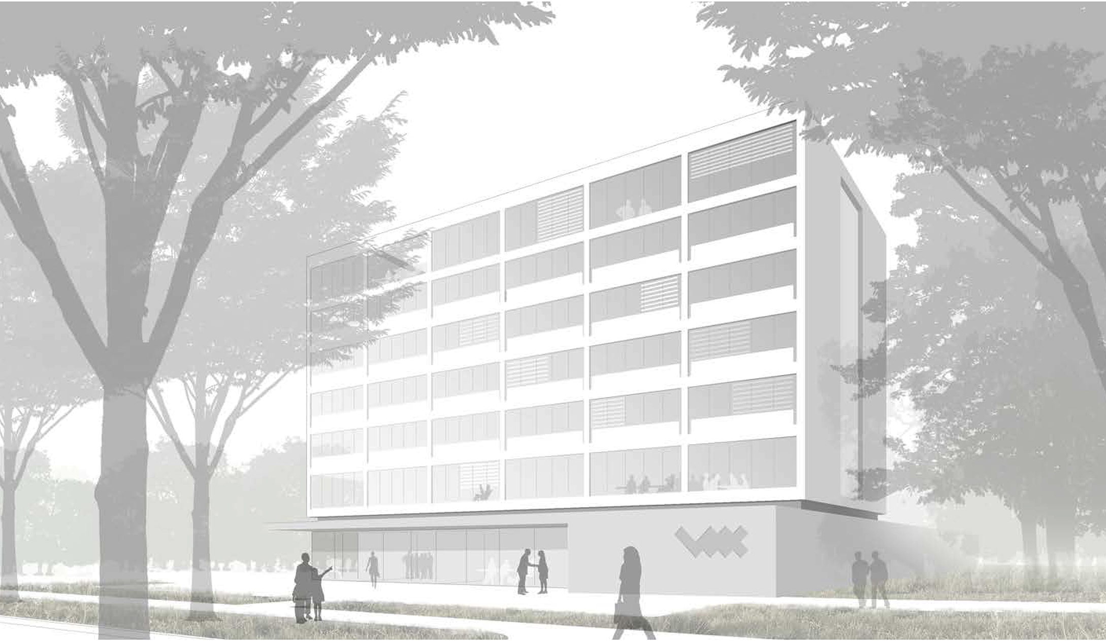 Der neue Sitz der Wohnbaugruppe Augsburg wird als ein Gebäudekomplex konzipiert, dessen Volumen eine adäquate Antwort auf die großflächigen Bauten der Umgebung gibt und der als markanter Stadtbaustein in Erscheinung tritt. Das neue Verwaltungsgebäude mit Werkstattbetrieb definiert mittels seiner Gebäudeform den räumlichen Abschluss des städtebaulichen Entwicklungsgebiets „Reese-Kaserne“ und schafft durch klare Raumkanten entlang der Somme-, Reinöhl- und Bürgermeister-Ackermann-Straße klar definierte Straßenräume.