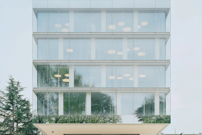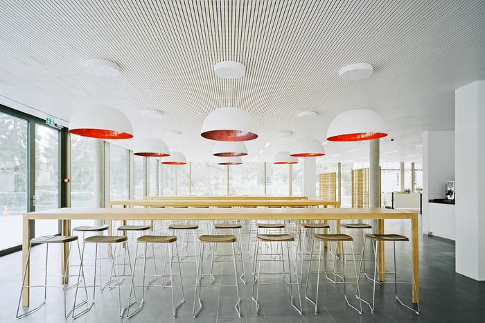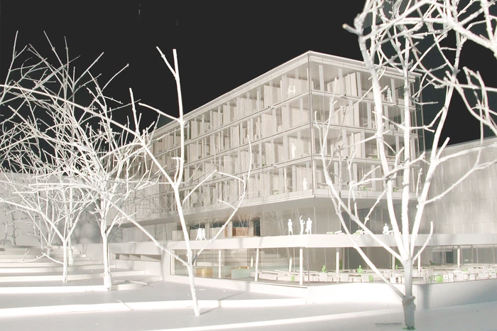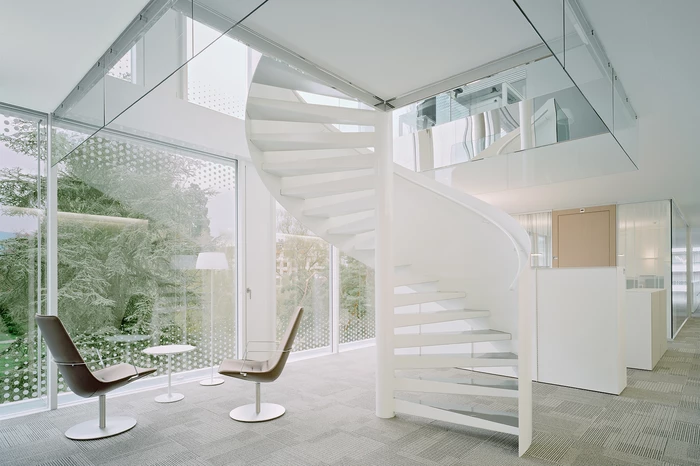 In der Sockelzone befinden sich die gemeinschaftlichen Einrichtungen. Der darüber schwebende, kristalline Baukörper beherbergt die Verwaltung und sämtliche Bürobereiche. Durch die konstruktive und klare plastische Ausbildung des Gebäudes wird ein Höchstmaß an Transparenz erzeugt. Je nach Lichtsituation scheint der Baukörper fast durchsichtig oder reflektiert den umgebenden Baumbestand und integriert sich so in den Park.