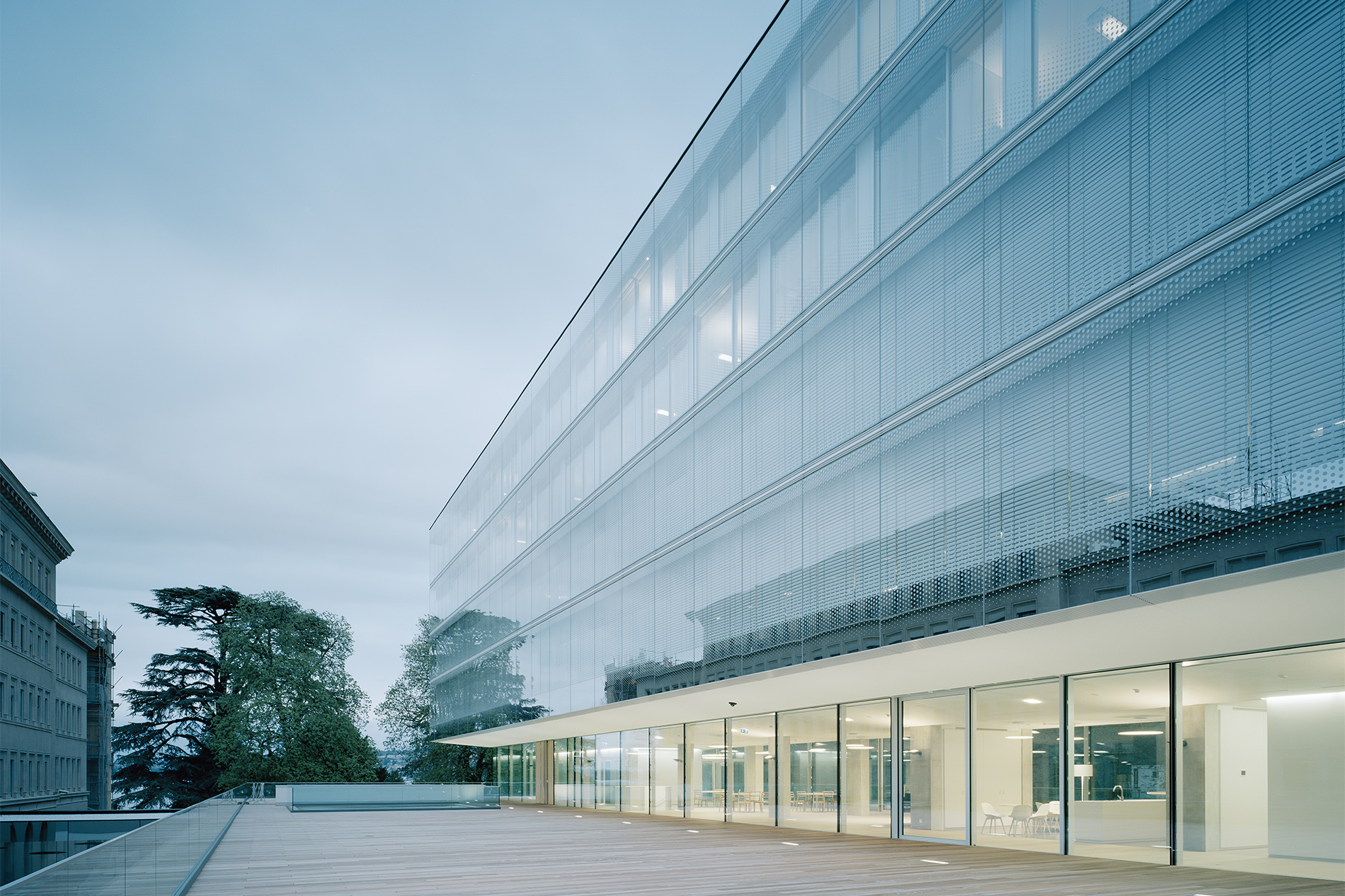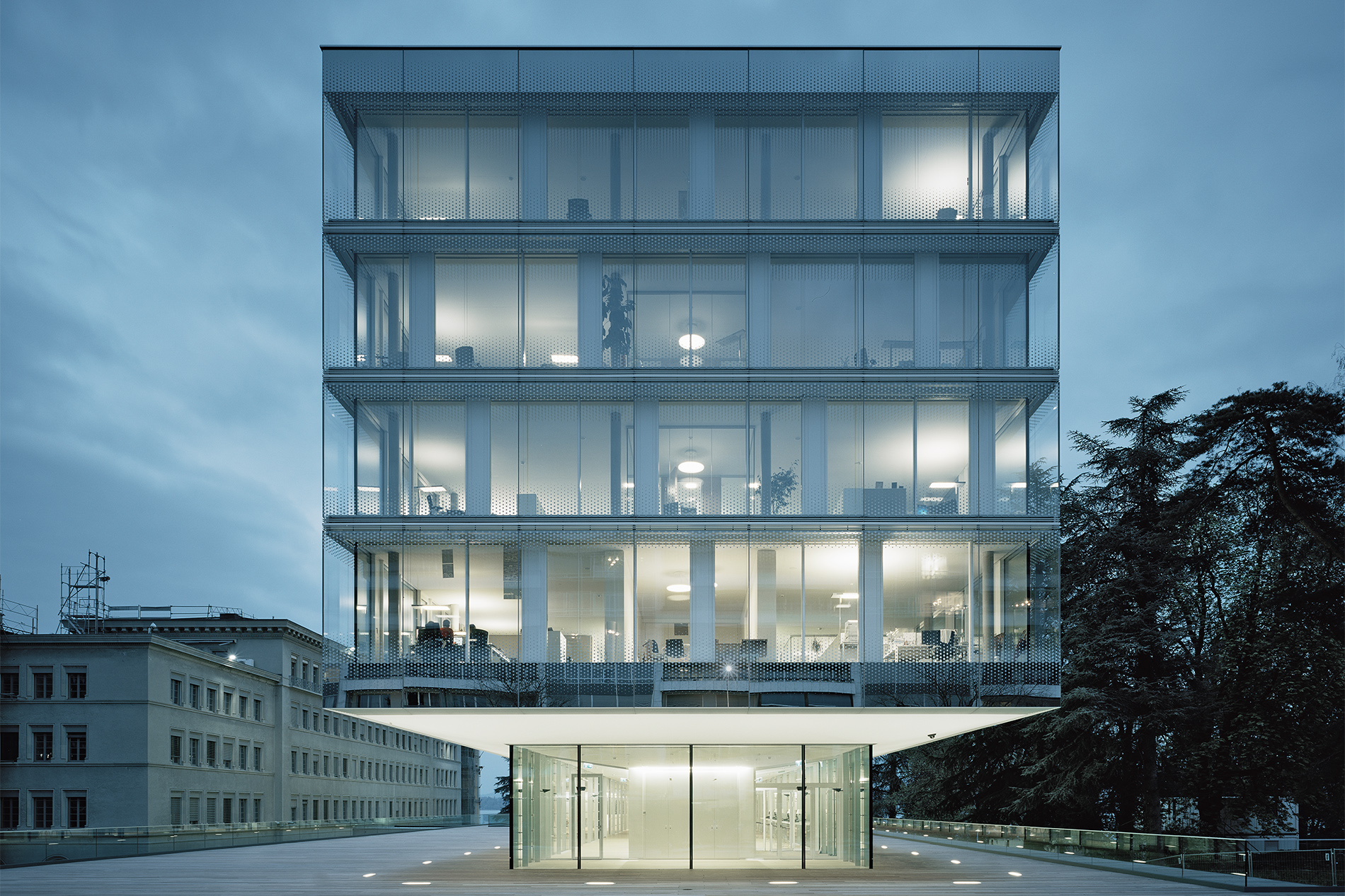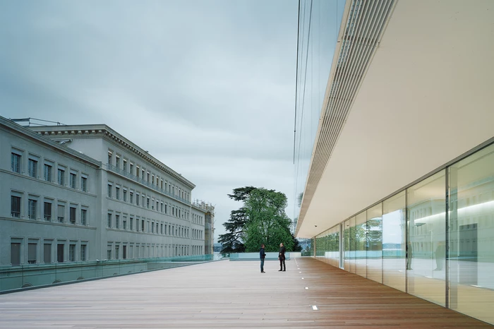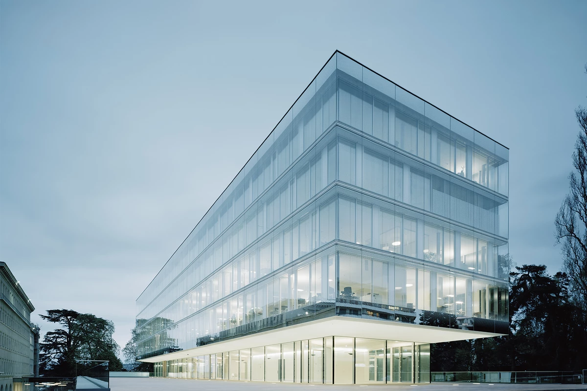 Der Erweiterungsbau des Hauptsitzes der WTO liegt am Ufer des Genfer Sees mit Blickbezug auf den Mont Blanc und inmitten einer beeindruckenden Parklandschaft. Er fügt sich souverän in die schwierige topografische Situation mit massiven Niveauunterschieden ein und generiert eine prägnante Verbindung zwischen Stadt, Park und See. Indem der Neubau weitestgehend auf der Fläche eines ehemaligen Parkplatzes liegt, konnte der alte Baumbestand des Grundstücks erhalten bleiben und es mussten keine zusätzlichen Flächen versiegelt werden. Die vorhandenen Baufluchten werden in Teilen aufgenommen und die Höhenentwicklung an der Gesamtanlage orientiert. In angemessenem Abstand zu den im neoklassizistischen Stil errichteten Gebäuden, schafft der Neubau gleichzeitig einen qualitätsvollen Außenraum. Es entsteht ein ausgewogenes, gut proportioniertes Gesamtbild, das durch den Dialog von Alt und Neu bereichert wird.