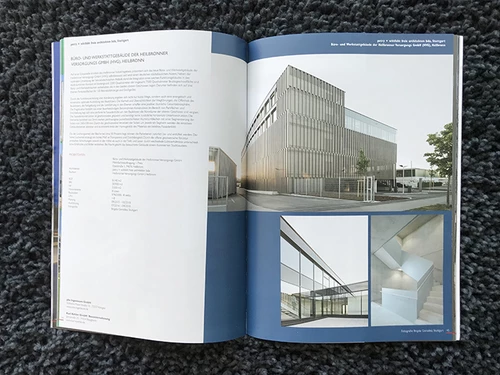Publikation der eingereichten Arbeiten zum Staatspreis Baukultur, der qualitätsvolles und zukunftsweisendes Bauen auszeichnet. Das von wittfoht architekten realisierte Verwaltungs- und Sozialgebäude Karl Köhler erhielt einen der acht vergebenen Staatspreise, das Büro- und Werkstattgebäude der Heilbronner Versorgungs GmbH eine Anerkennung.